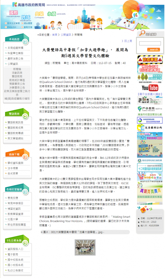 高雄市政府教育局新聞連結 類型:新聞稿 單位:高中職教育科 日期:112-07-15